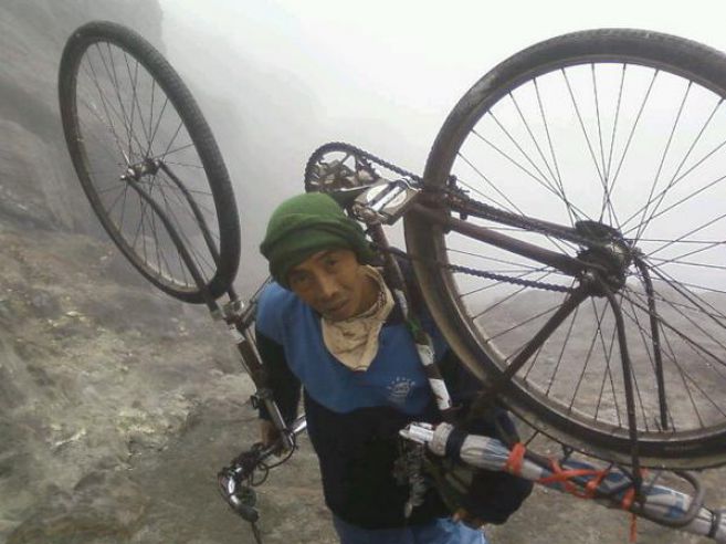| Ronny, pendaki gunung dengan membawa sepeda onthel kesayangan yang diberi nama Pertiwi Nusantara |