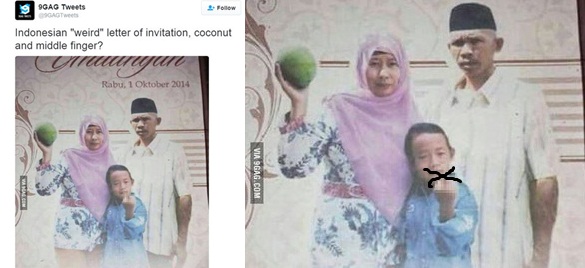 9Gag mengatakan di caption gambar itu: "Indonesian "weird" letter of Invitation, coconut and middle finger?" yang berarti 9Gag sendiri juga tidak mengetahui alasan mengapa hal itu bisa dilakukan oleh mereka.