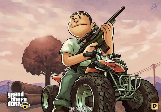 Baru-baru ini, seniman bernama En, telah merombak serial Doraemon ke dalam versi Grand Theft Auto, yakni video game seri populer dengan penjualan terbesar pada tahun 2013, bahkan juga dalam sejarah.