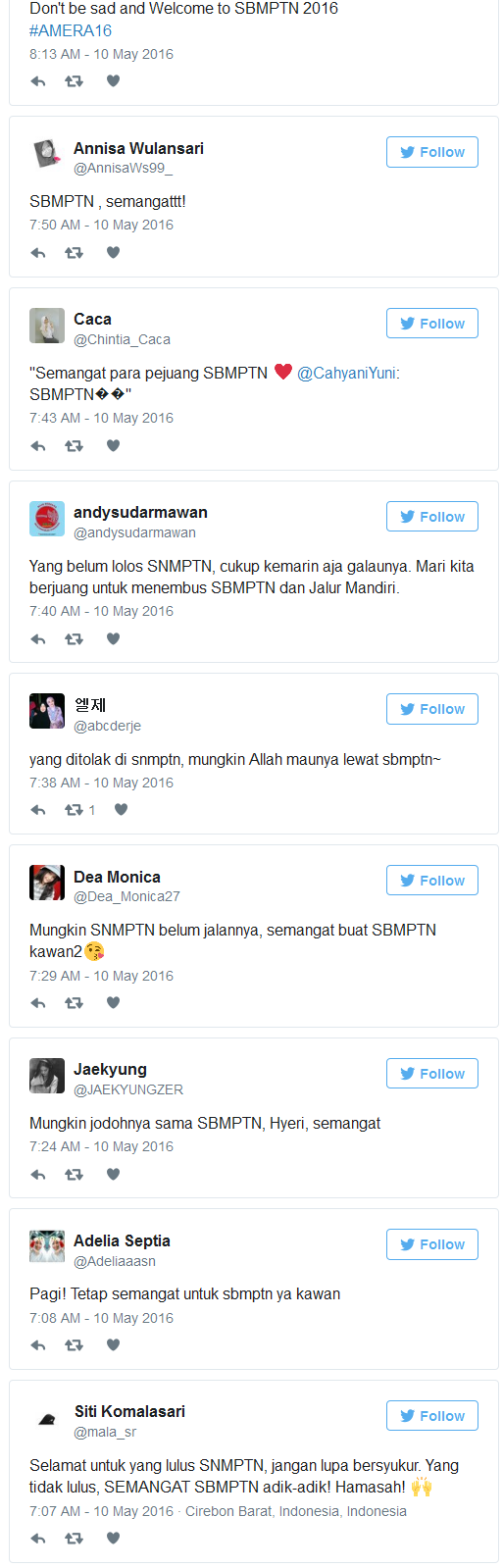 Meski beberapa ada yang melontarkan protes soal transparasi SNMPTN, namun nyatanya tak sedikit juga yang optimis menatap SBMPTN. Para peserta dan non-peserta SBMPTN pun berkicau soal optimisme mengejar kursi di Perguruan Tinggi Negeri (PTN). Berikut beberapa di antaranya.