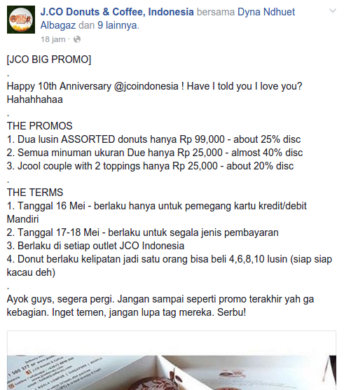 Ayok guys, segera kunjungi outlet JCo terdekat. Jangan sampai promonya habis dan kamu nggak kebagian. Inget temen, jangan lupa untuk tag mereka. Serbu!