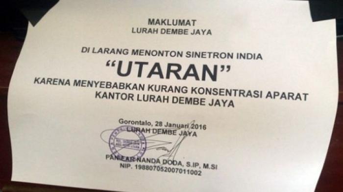 "Dilarang menonton sinetron India Uttaran karena menyebabkan kurang konsentrasi aparat kantor Lurah Dembe Jaya," bunyi maklumat yang dikeluarkan oleh sang lurah.