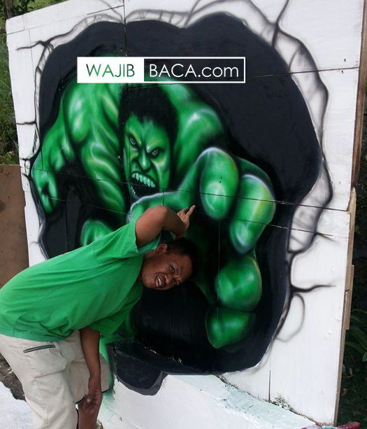 Kemudian lukisan karakter Hulk yang mengamuk dan hendak mencekram seseorang.