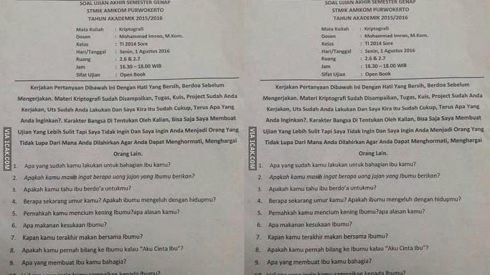 Dikutip Wajibbaca dari Tribunnews, tujuannya menuliskannya adalah agar seluruh muridnya tahu bagaimana perjuangan orang tua untuk mereka. Diambil dari 1Cak.com, berikut merupakan soal-soal yang ditulis oleh dosen unik tersebut :