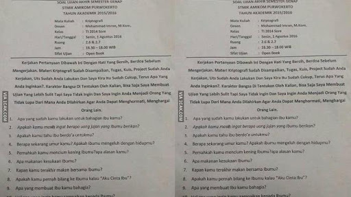 Penulis Unknown | Ditayangkan 22 Oct 2016 Seorang dosen kriptografi asal STIMIK AMIKOM Purwokerto, Jawa Tengah baru-baru ini menghebohkan netizen. Adalah Mohammad Imron, M.Kom, yang telah mebuat soal yang melenceng jauh dari yang harus ia ajarkan.