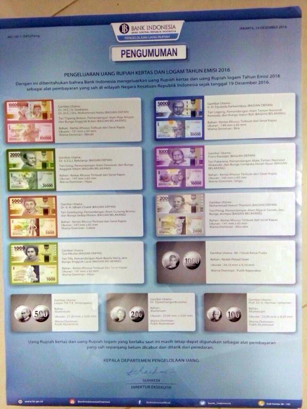 Bank Indonesia (BI) akan mengeluarkan satu seri uang Rupiah Tahun Emisi (TE) 2016 pada, Senin (19/12/2016) ini. Peluncuran uang rupiah baru yang akan berlangsung di Gedung BI, Jakarta, tersebut akan dihadiri oleh Presiden Joko Widodo (Jokowi).