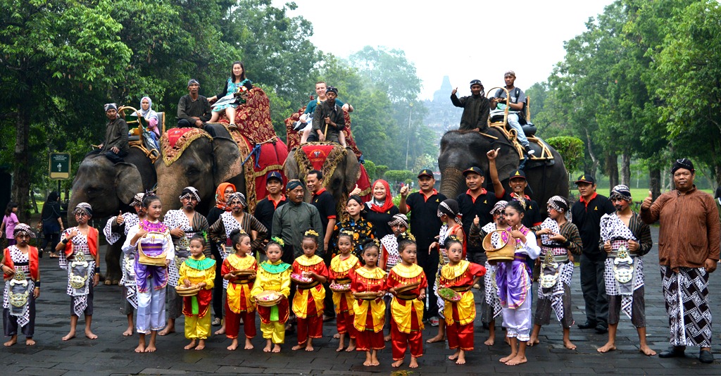 Mereka yang datang pagi sekali, sehingga menjadi pengunjung pertama di situs warisan dunia tersebut, kompak disambut gembira dengan kalungan bunga dan diberikan souvenir batik khas Borobudur yang indah. Tak hanya sampai disitu, mereka kemudian diarak oleh belasan pasukan "Bergodo" berpakaian unik menuju lokasi wahan naik gajah. Dengan wajah sumringah mereka pun diajak menunggangi gajah secara gratis berkeliling komplek TWC.