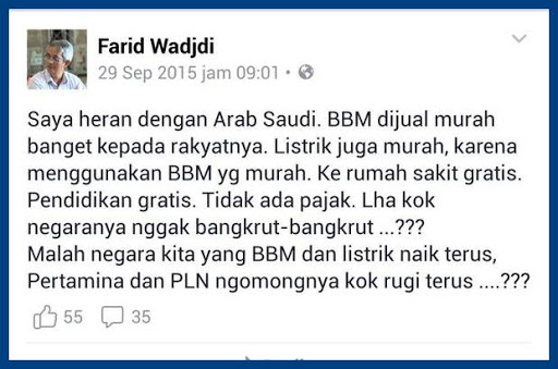 "Saya heran dengan Arab Saudi. BMM dijual murah banget kepada rakyatnya. Lsitrik juga murah, karena menggunakan BBM yang murah. Ke rumah sakit gratis. Pendidikan gratis. Tidak ada pajak. Lha kok negaranya nggak bangkrut-bangkrut....??