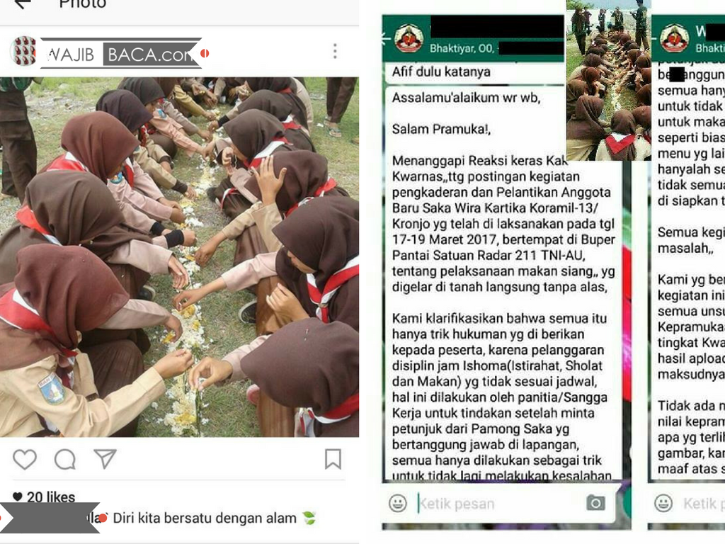 Kegiatan pramuka yang fotonya viral karena terlihat mereka makan bersama di tempat tanpa alas, hingga nasinya bercampur dengan rumput dan lain - lain. Akhirnya ditanggapi oleh panitia pelaksana.