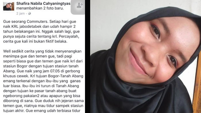 "Gue duduk nih jejeran sama temen gue, niatnya mau tidur sampek stasiun tujuan akhir. Gue emang uda terbiasa tidur di krl. Krl udah kayak rumah kedua buat gue,"tulis Shafira dalam statusnya itu.