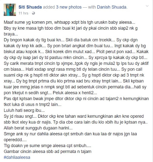 Dia pun mengatakan, mungkin adiuknya itu menelan cincin yang dipakainya.