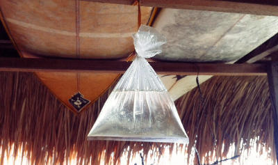 Cara ini memang bukan cara baru lagi karena sudah banyak digunakan. Bahkan kita sering menjumpainya di warung-warung air putih yang dibungkus dengan plastik kemudian di gantung.