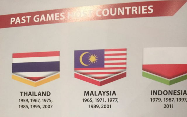 Pada Sabtu (19/8) kemarin, SEA Games 2017 resmi dibuka. Pembukaannya sendiri berlangsung di Stadion Bukit Jalil, Kuala Lumpur, Malaysia. Waktu itu, semua tamu undangan, termasuk para petinggi dari Indonesia, menerima buku cinderamata berisi panduan pelaksanaan SEA Games 2017. Dalam buku itu ada halaman yang khusus mencantumkan bendera-bendera negara yang pernah jadi tuan rumah SEA Games. Tapi ada yang menarik perhatian di sana.