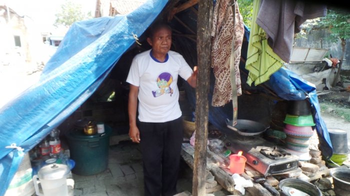 "Rumah sudah dibongkar. Kami berniat membangunnya. Uang sudah siap, tapi ada saja masalahnya, istri saya sakit lah dan yang lain- lain," tutur Mulyono yang suaranya berubah jadi parau. Matanya pun berkaca- kaca.