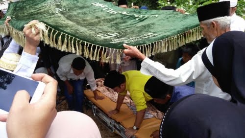 Setibanya di pemakaman, dari ambulance, jenazah almarhum digotong dengan keranda.