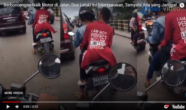 Beredar video kocak di media sosial yang memperlihatkan dua lelaki berboncengan naik motor.