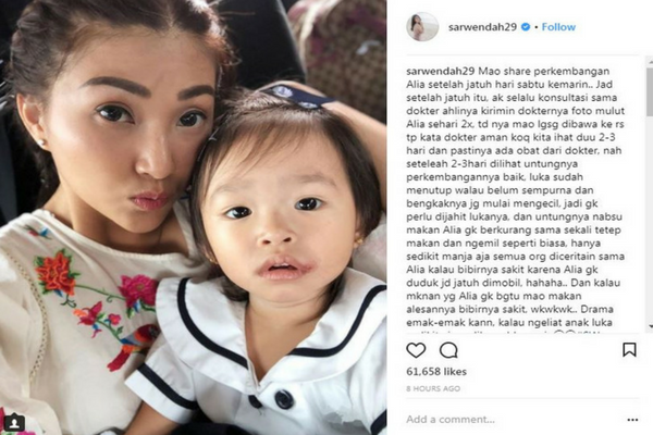 Drama emak-emak kann, kalau ngeliat anak luka sedikit aja sedihnya bkn main????#SW #Sarwendah #MotherHood," tulis Sarwendah via @sarwendah29.
