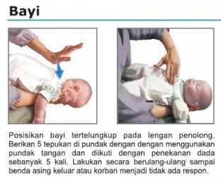 • Untuk melakukan pukulan balik: Letakkan bayi di lengan bawah dengan kepala disangga oleh tangan dan dadanya lebih tinggi dari kepalanya. Dengan menggunakan punggung tangan, berikan pukulan di punggungnya, tepatnya di antara tulang belikat.