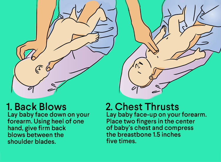 Secara bergantian lakukan lima pukulan punggung dan lima dorongan dada, putar bayi dari punggungnya ke depan sampai benda itu dikeluarkan atau anak batuk, menangis atau bernapas dengan kuat.
