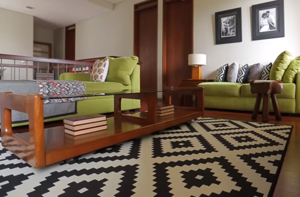 Karpet hitam putih pun menjadi kesan yang cocok untuk dekorasi ruang tamu ini.