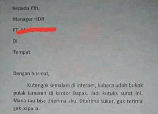 Foto surat lamaran kerja itu diunggah di sebuah grup Facebook bernama Cocoklogi Science pada hari Jum’at (3/11). Bukan surat Kids Jaman Now namanya kalau isi surat lamaran pekerjaan itu biasa saja.