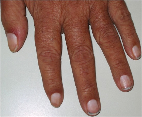 Sebagai contoh, muncul dengan bentuk garis putih ganda berjalan di kuku, formasi yang dikenal sebagai Muehrcke's lines atau garis Muehrcke.