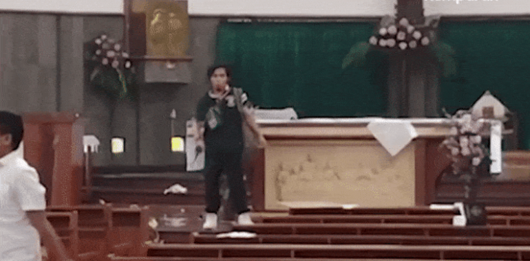 Pelaku penyerangan yang bernama Suliyono masuk ke dalam gereja sambil membawa parang menyerang jemaat yang tengah beribadah.