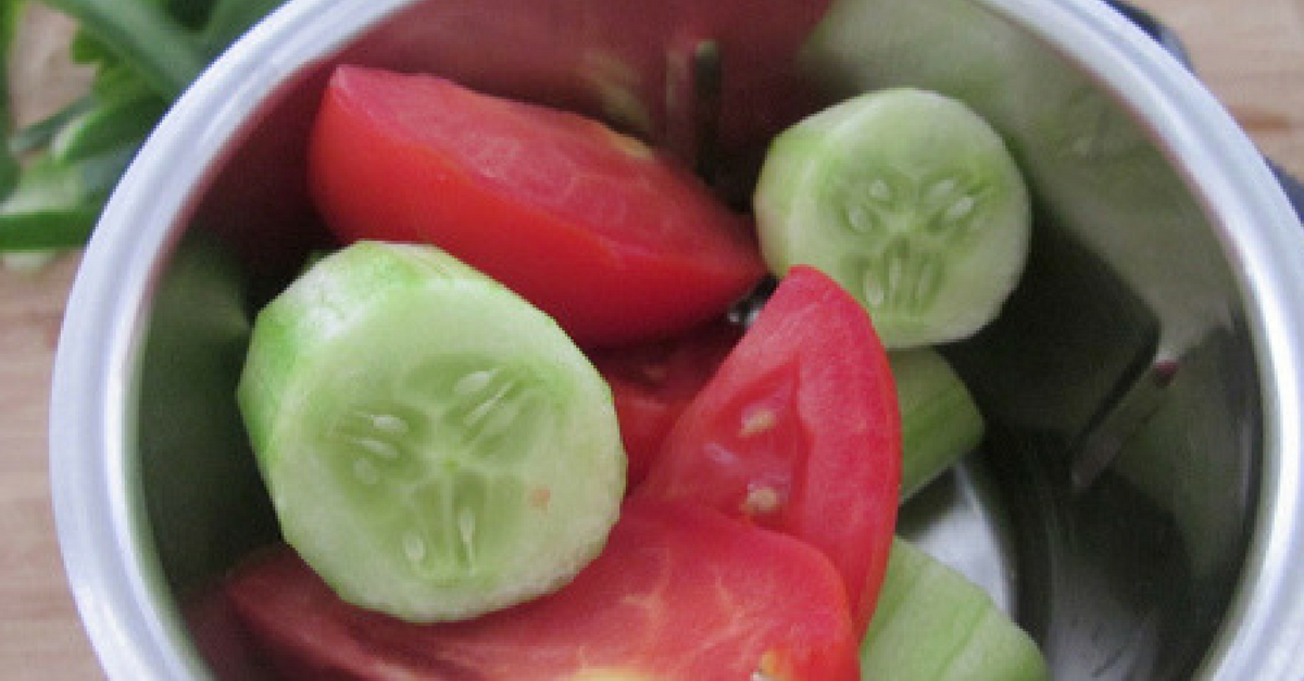 - Hancurkan tomat segar dan saringlah, lalu buat sedikit jus mentimun dantambahkan ke jus tomat.