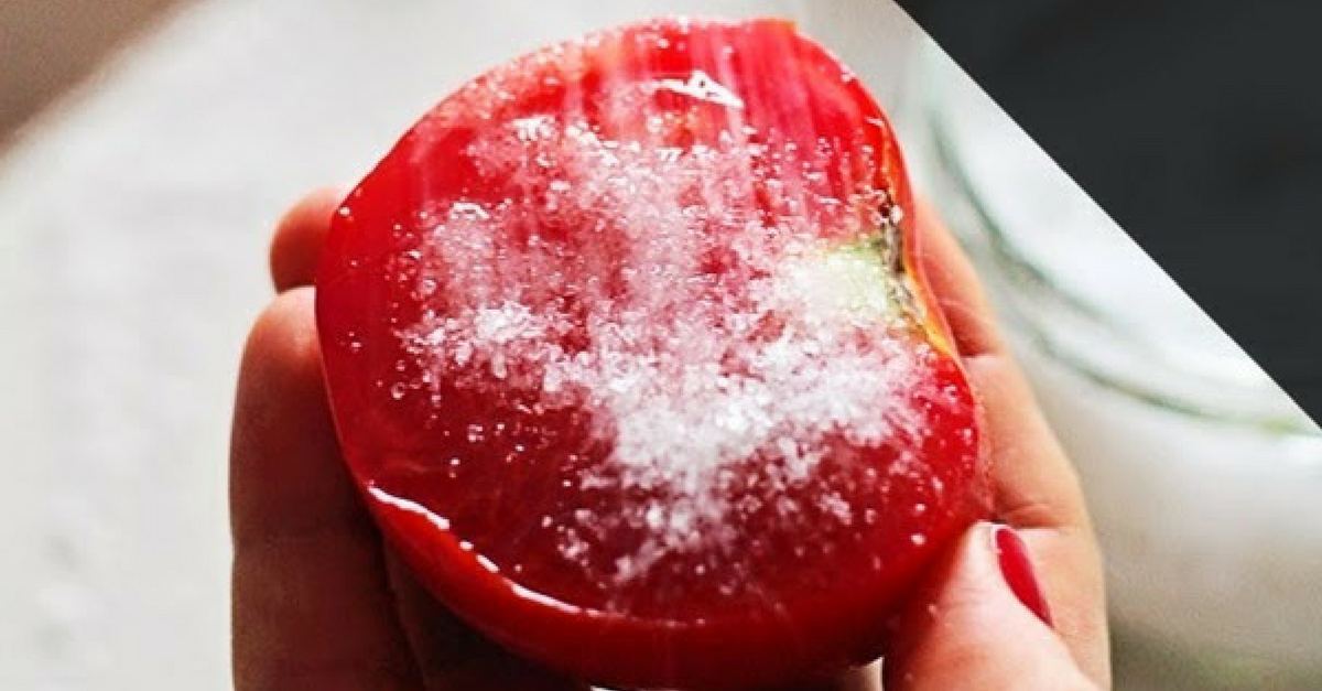 Gunakan potongan tomat berlapis gula untuk mengelupas wajah Moms dengan lembut menggunakan gerakan melingkar.