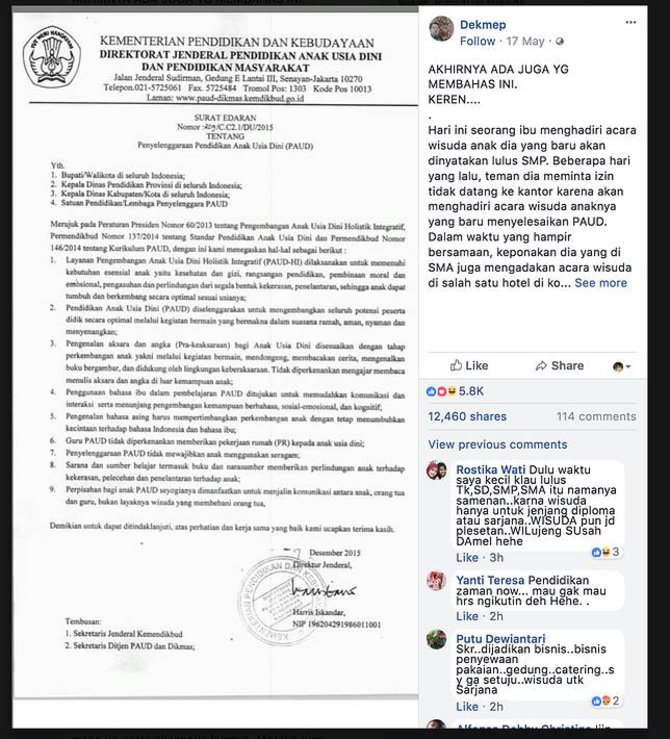 Sebuah tulisan di Facebook mendadak viral, kala pemilik akun tersebut mengatakan jika prosesi “wisuda” yang dilakukan di setiap jenjang pendidikan, terlebih lagi untuk anak usia dini dinilai tidak etis. Karena kegiatan itu sama saja seperti memperlakukan anak-anak yang tidak sesuai dengan usianya.