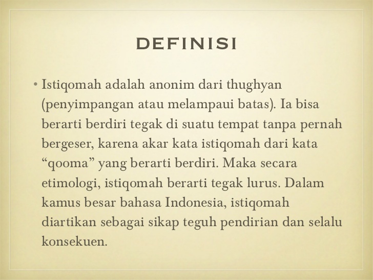 Masih banyak orang bertanya-tanya apa arti dari kata istiqomah. Kata istiqomah sering di dengar pada sebuah kegiatan keagamaan. Istiqomah dalam islam berarti terus menjalankan kewajiban dan menjauhi larangan Allah SWT serta tetap berada pada jalan yang lurus.