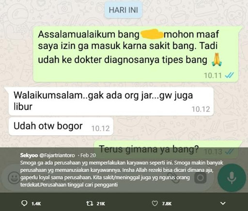 Kicauan itu menampilkan capture percakapan seorang karyawan dengan atasannya. Si karyawan bernama Fajar itu meminta izin tidak masuk kerja karena merasa tidak enak badan.
