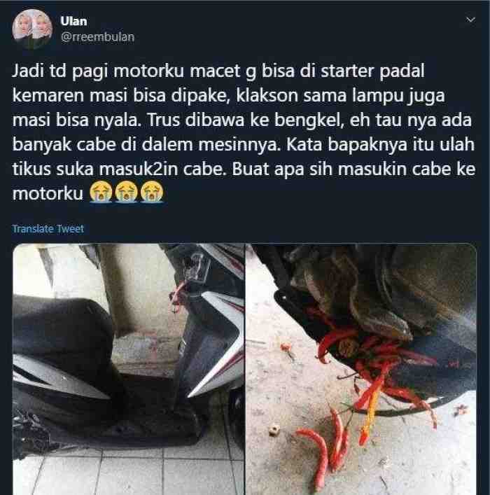 Jika biasanya penyebab motor mogok adalah bensin yang habis atau aki yang rusak, motor netizen ini justru mengalami mogok karena cabe. Usai viral di Twitter, netizen dibuat bertanya-tanya mengenai hal ini.