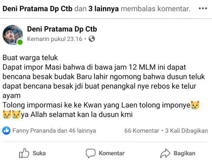 Beberapa unggahan muncul di media sosial Facebook mempertanyakan bahkan ikut membagikan cerita tersebut.