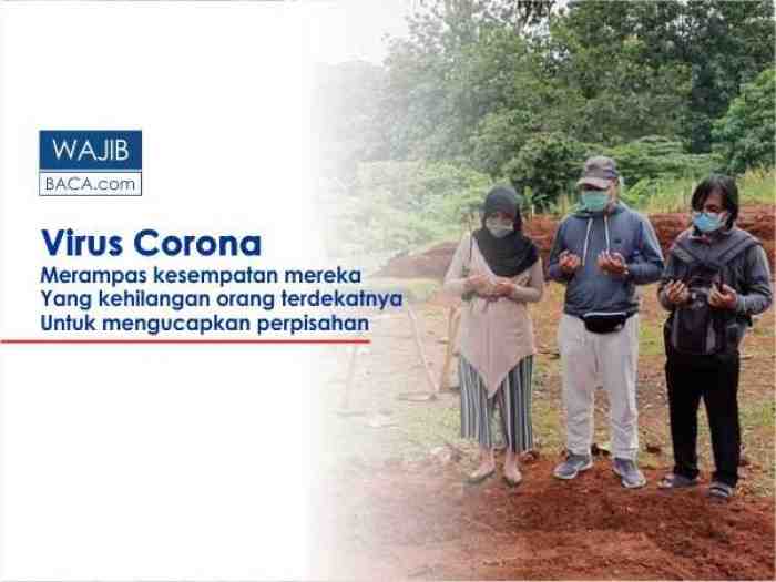 Anaknya bahkan tak bisa melihat wajah sang bunda sejak diisolasi hingga kepergiannya. Virus corona merampas kesempatan mereka yang kehilangan orang terdekatnya untuk mengucapkan kalimat perpisahan. Sekedar melihat wajah saja tak mampu, apalagi membelai dan mencium jenazah.