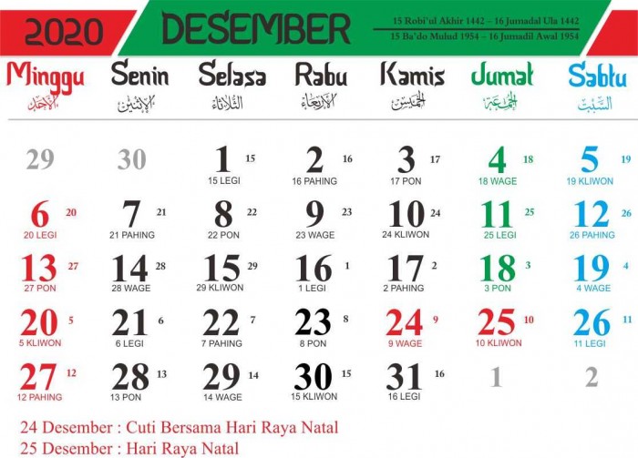Kalender 2020 Indonesia lengkap Desember 1441 Hijriyah - Image from tahunbaruimlek.com