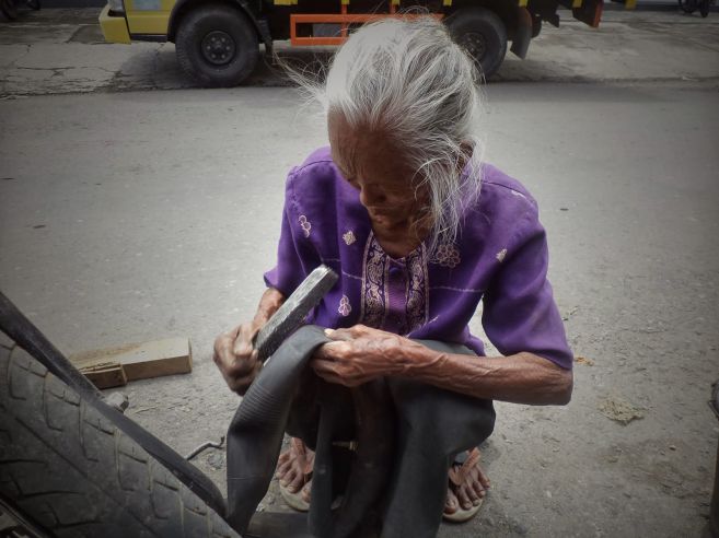 Menurutnya, selama ia masih kuat melakukan pekerjaan itu, maka ia akan melakukannya. Meski tangannya sudah keriput, namun ia begitu terampil mengeluarkan ban dalam kemudian menambal ban motor yang bocor milik pelanggannya.