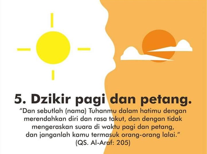 5. Dzikir Pagi dan Petang. “Dan sebutlah (nama) Tuhanmu dalam hatimu dengan merendahkan diri dan rasa takut, dan dengan tidak mengeraskan suara di waktu pagi dan petang, dan janganlah kamu termasuk orang-orang yang lalai.” (QS. Al Araf:205)