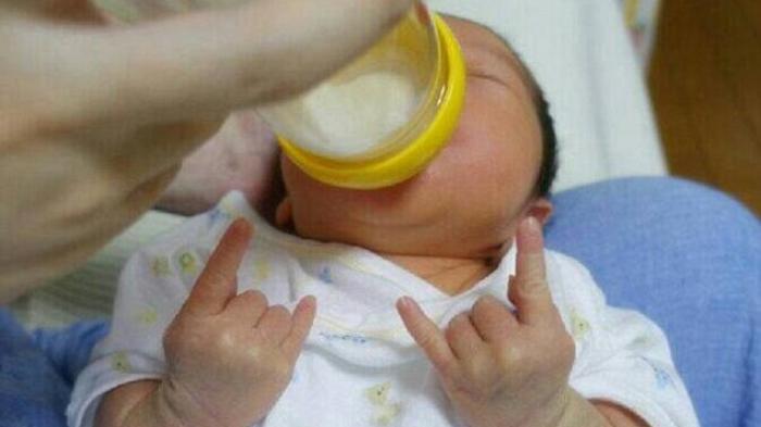Uniknya, dalam foto yang diunggah tersebut, nampak bayi perempuan mungil yang sedang minum susu dari botol susu itu mengangkat kedua tangannya dan membentuk lambang ‘metal’. Sontak foto tersebut menjadi viral di Facebook dan menghebohkan netizen.