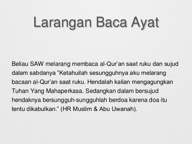 Hal ini dilarang, berdasarkan sebuah riwayat dari Ibnu Abbas, bahwa Nabi bersabda, "saya telah dilarang untuk membaca Al-Qur'an selama ruku' atau dalam sujud." (HR. Muslim)