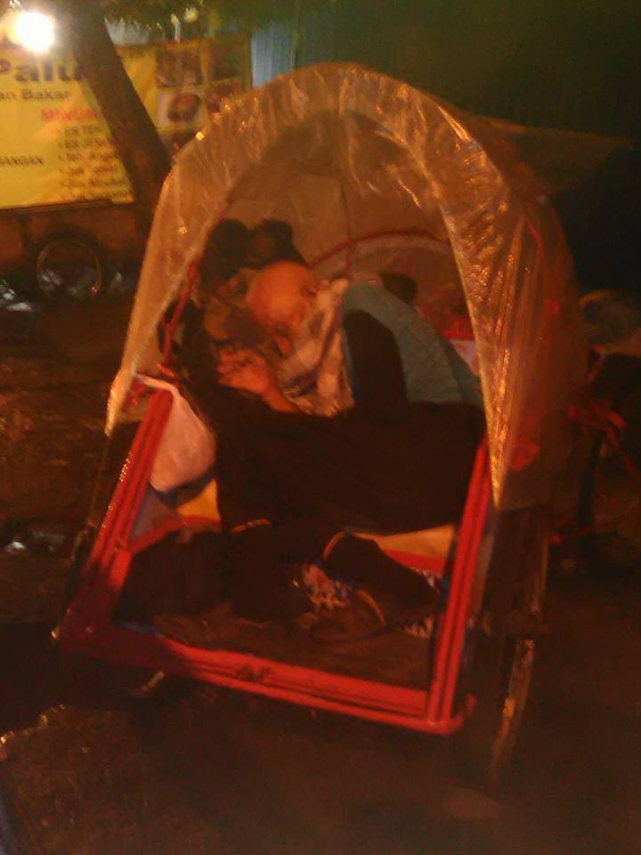 sehari-hari beliau tidur di becak, tas besar dll jg ada di becak. sya tdk bayangkn gmn buang airnya..???