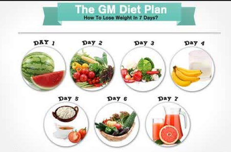 Secara umum dan mendasar jika ingin menurunkan berat badan yang di lakukan hanya berolahraga dan makan makanan yang sesuai untuk tubuh jika salah satunya tidak dilakukan maka akan menimbulkan kondisi tubuh yang tidak seimbang. Berikut adalah rencana diet ala general motors dalam 1 minggu :