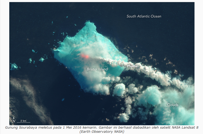 Gunung Sourabaya yang berada di Pulau Bristol meletus pada 1 Mei 2016 kemarin. Kejadian ini berhasil diabadikan oleh satelit NASA