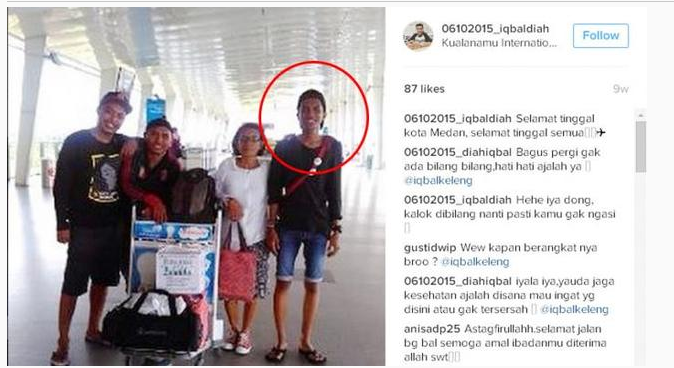 Mengenakan kaos warna hitam dan celana jeans selutut, Iqbal yang mengenakan topi ditarik ke belakang terlihat berpose dengan sebuah troli bagasi bersama dengan tiga orang lainnya. Dyah, kekasihnya yang tidak mengetahui kepergian Iqbal saat itu juga sempat mengucapkan kalau dirinya harus hati-hati. "Bagus pergi gak ada bilang bilang,hati hati ajalah ya," sahutnya di akun Instagramnya.