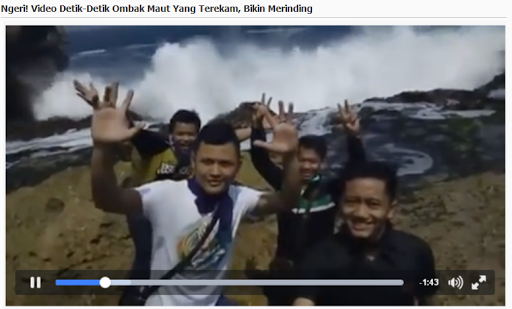 Penulis Penulis | Ditayangkan 13 May 2016Memang saat ini sedang trend selfie dengan background pemandangan yang kebanyakan orang belum pernah mengabadikannya, seperti di atas gedung, di puncak gunung atau malah di tempat ekstrem yang seharusnya bukan menjadi tempat yang pas untuk mengabadikan sebuah pemandangan, seperti 4 remaja ini yang hampir kehilangan nyawa karena terseret ombak yang sangat besar di kedung tumpang tulungagung :