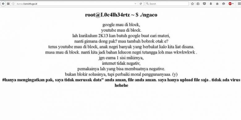 Seorang hacker mengupload file yang berisi artikel curhatanya di laman pengaduan masyarakat (Dumas) situs web Kementerian Komunikasi dan Informatika (Kominfo), setelah situs Ikatan Cendekiawan Muslim Indonesia (ICMI), hal ini diduga terkait wacana pemblokiran Google dan YouTube.