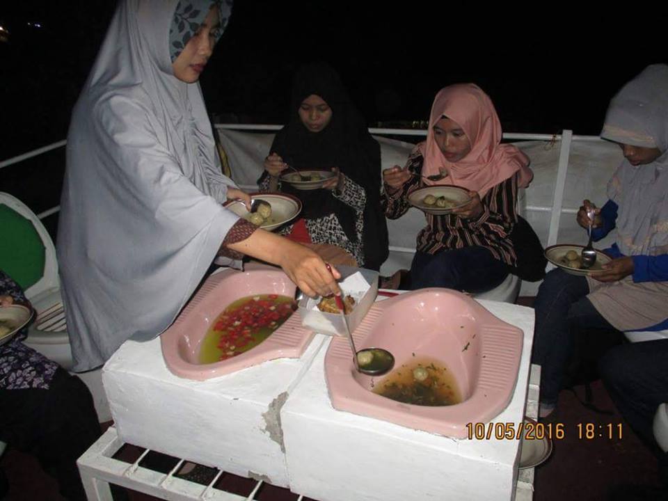 Makanan dan minuman, seperti bakso, sayur dan es buah, disajikan di dalam wadah yang menyerupai kloset atau tempat buang air besar.