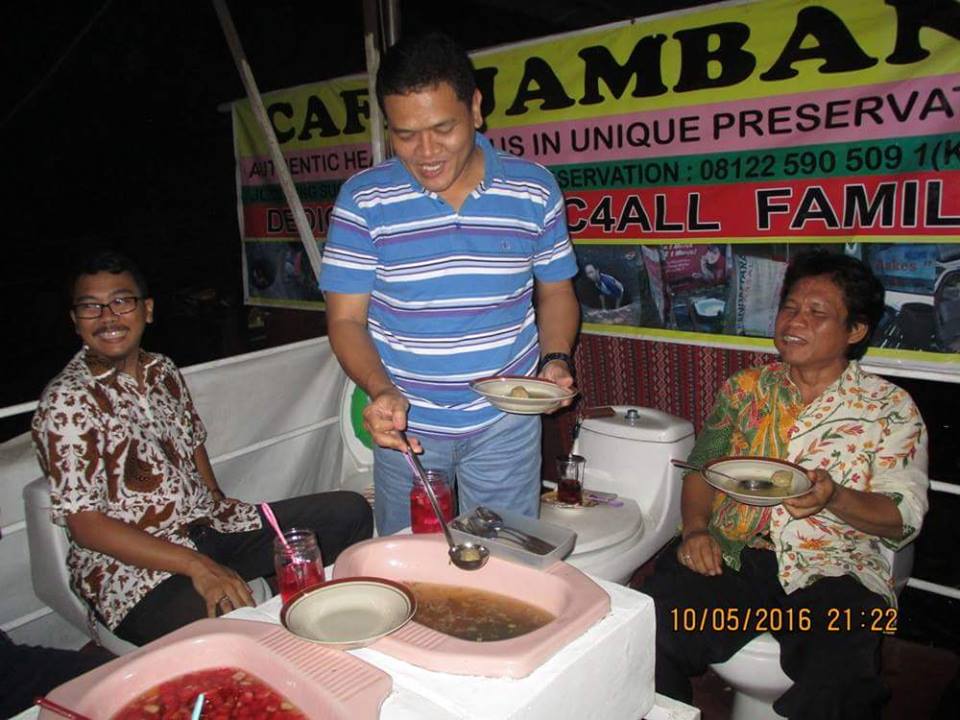 Sejumlah foto makanan dan minuman, seperti bakso, sayur dan es buah, yang disajikan di dalam wadah menyerupai kloset atau tempat buang air besar diunggah di laman fanpage Facebook Kick Andy Show dan menuai protes. Beginilah suasana para pengunjung Cafe Jamban yang ada di Banjarmasin, Kalimantan Selatan.