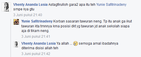 “Inalillahi wa innailaihi rojiun, InsyaAllah dek tempatmu di surgaNya, sedih liat kelakuan anak2 jaman skr” akun Endang Lidyani mendo’akan.
