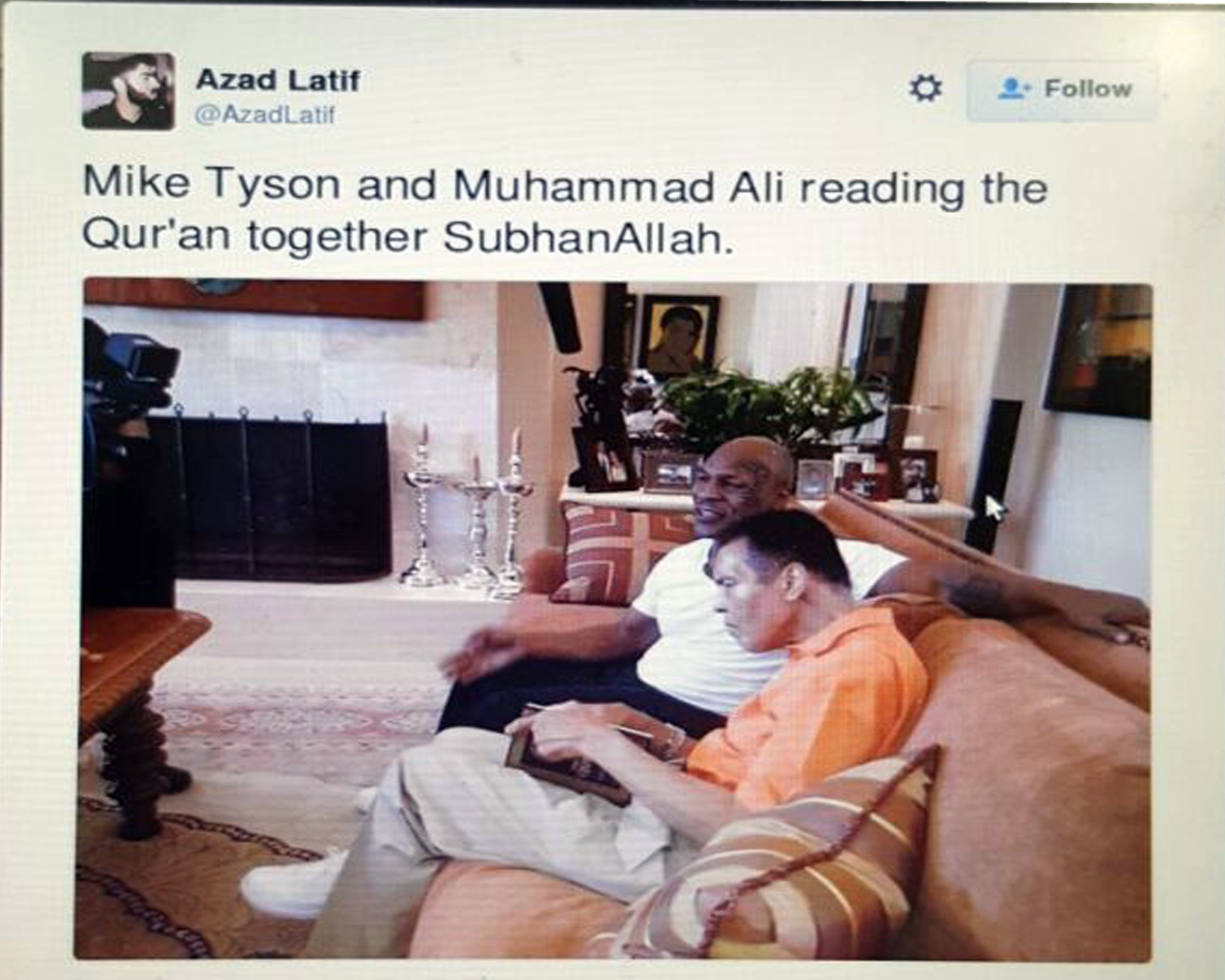 Tyson dan Ali memang dikenal dekat. Salah satu foto yang juga memperlihatkan keakraban keduanya, dan juga sempat membuat heboh dunia maya, adalah foto keduanya duduk bersama di sofa. Dilansir detik.com, dalam foto itu, Ali, yang terlihat jauh lebih tua dibanding foto unggahan Tyson, sedang memegang Alquran. Tyson duduk di sampingnya, wajahnya sudah berhias tato.